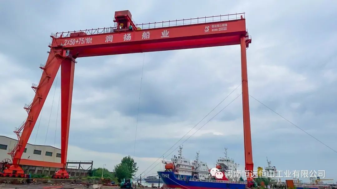 Recently, the MEC2*50+75 shipbuilding gantry crane, manufactured by our company, was successfully installed in Yangzhou, Jiangsu Province. This product has a lifting height of 36.8 meters and a span of 54 meters.